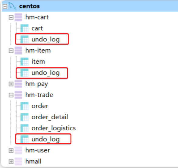 因为交易过程涉及hm-trade、hm-cart、hm-item三个模块,运行day05资料的seata-at.sql分别文件导入hm-trade、hm-cart、hm-item三个数据库中。结果: