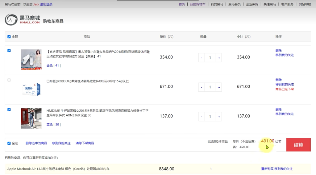 现在可以测试了,先在前端购物车中选中几个需要购买的商品,然后点击结算。