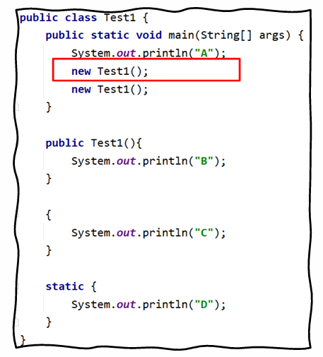 进入main函数,触发初始化,打印D,然后正常执行打印A,然后new了Test1,触发Test1的初始化,打印C,再打印B,第二次new,再次打印CB,最终是DACBCB。