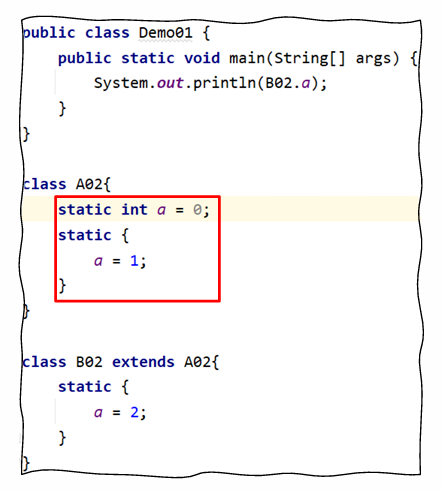 调用B02,会初始化,但是B02继承自A02,所以会先调用A02的初始化,再调用B02的初始化,最终a等于2。