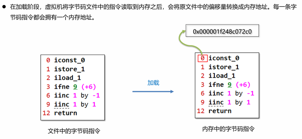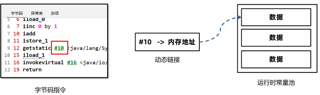 • 动态链接:当前类的字节码指令引用了其他类的属性或者方法时,需要将符号引用(编号)转换成对应的运行时常量池中的内存地址。动态链接保存了编号到运行时常量池的内存地址的映射关系。