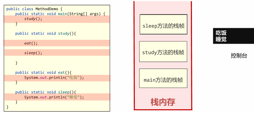 进后出(First In Last Out),每一个方法的调用使用一个栈帧(Stack Frame)来保存。