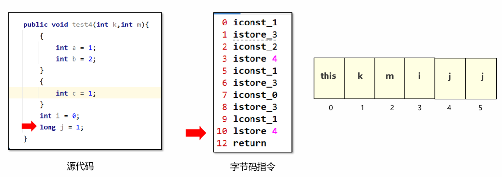为了节省空间,局部变量表中的槽是可以复用的,一旦某个局部变量不再生效,当前槽就可以再次被使用。(下图中 a、b、c均是在运行中不再生效的内容。)