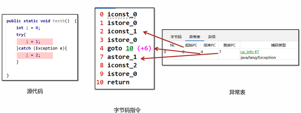 • 异常表的引用:异常表存放的是代码中异常的处理信息,包括了异常捕获的生效范围以及异常发生后跳转到的字节码指令位置。