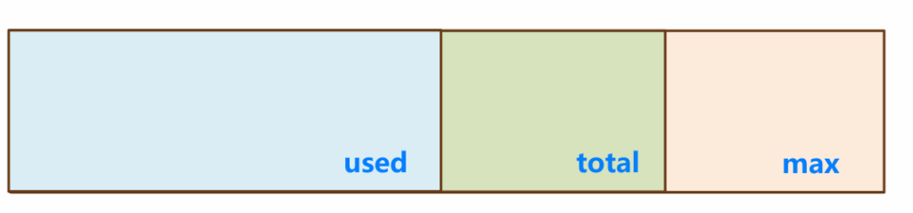 堆空间有三个需要关注的值,used total max。used指的是当前已使用的堆内存,total是java虚拟机已经分配的可用堆内存,max是java虚拟机可以分配的最大堆内存。
