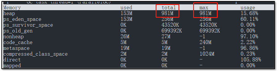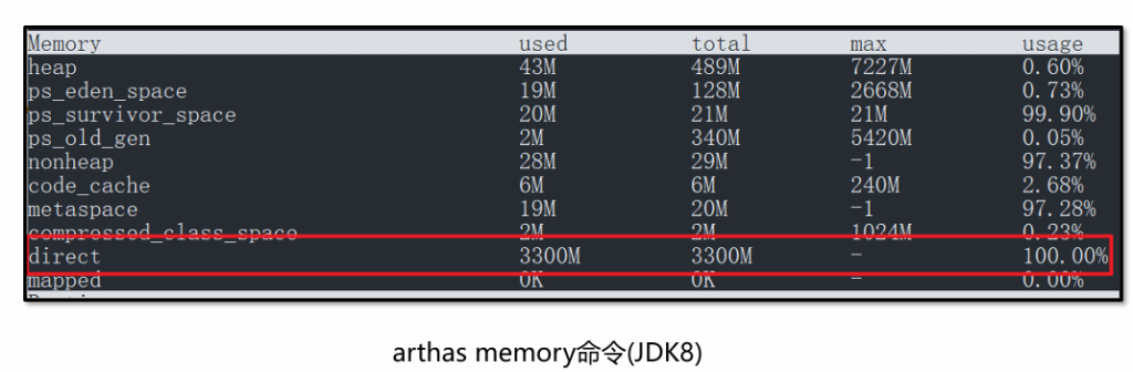 ⚫ 注意事项: arthas的memory命令可以查看直接内存大小,属性名direct。