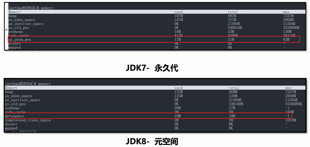 arthas可使用memory打印出内存情况,JDK7及之前的版本查看ps_perm_gen属性。JDK8及之后的版本查看metaspace属性。