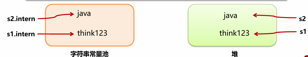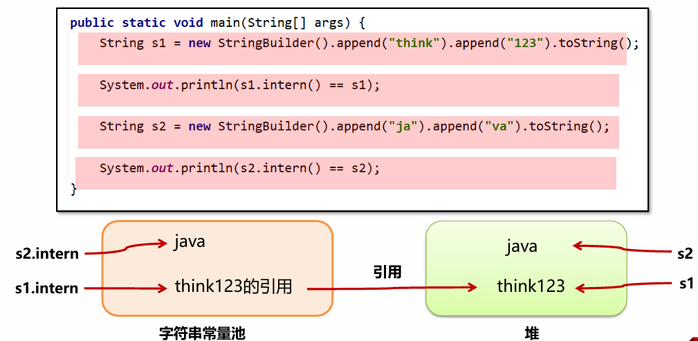 JDK7及之后版本中由于字符串常量池在堆上,所以intern () 方法会把第一次遇到的字符串的引用放入字符串常量池。