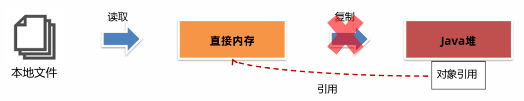 现在直接放入直接内存即可,同时Java堆上维护直接内存的引用,减少了数据复制的开销。写文件也是类似的思路。