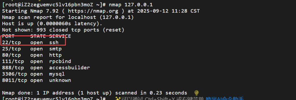 查看端口号:nmap 127.0.0.1 保证有22端口