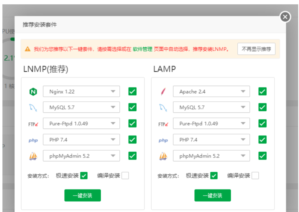 登录后看到下图内容,安装LNMP(推荐)这个,直接按“一键安装”就行