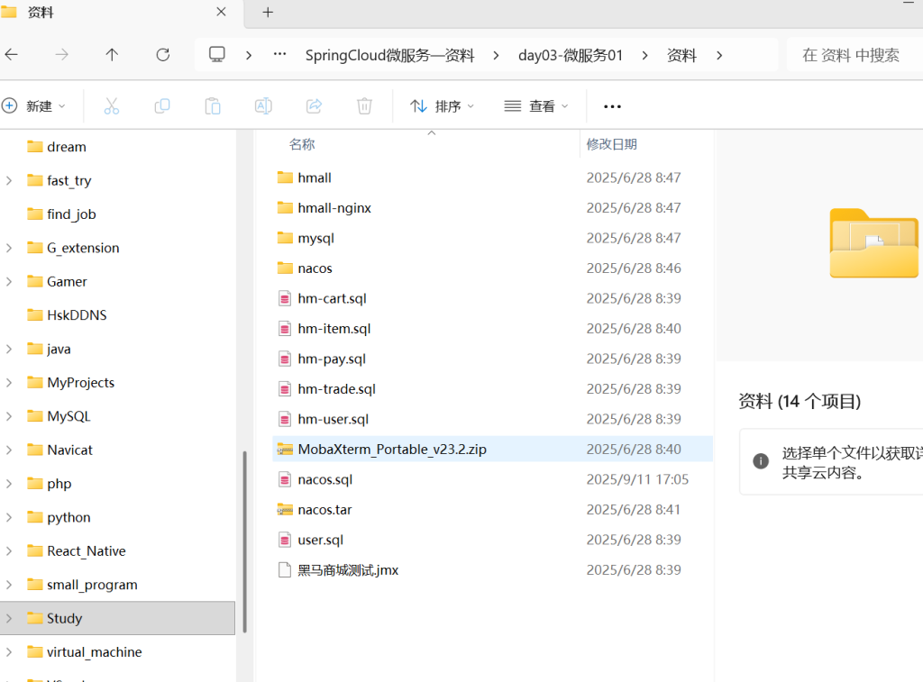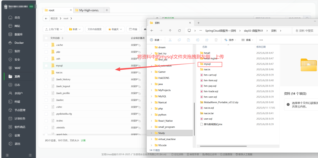 点击“文件”,进入根目录/root/,然后将资料中的mysql文件夹拖拽进去(这个mysql文件夹包含两个文件,一个是conf,mysql的配置文件,另一个是init,是mysql的初始化文件,mysql创建时会调用这个文件夹中的所有sql文件,创建数据库)