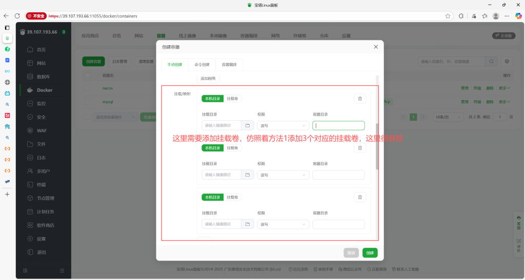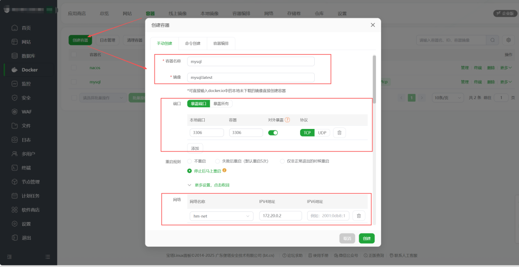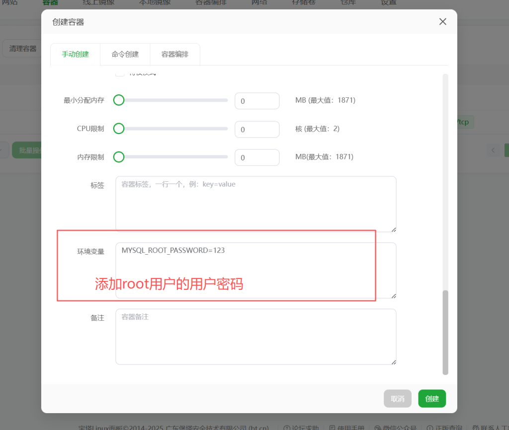 2.使用宝塔的图形化界面操作,如下图:(实话实说,使用图形化创建mysql很麻烦,建议使用终端)