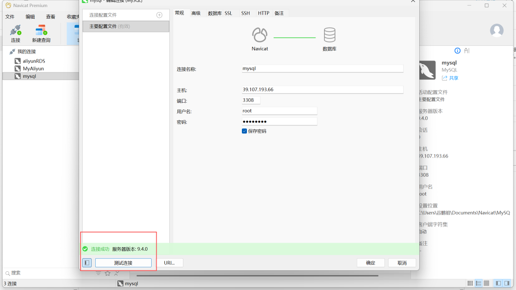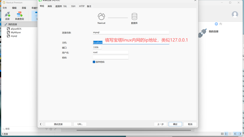 很多数据库图形化软件都能实现这个功能,我使用的是navicat,其中主机填写你的宝塔内网的ip地址,比如172.22.129.22(这个是我临时使用的,需要填写你自己的),端口填写刚刚创建的(通常是3306),用户名是root,密码是上面在环境变量中设定的