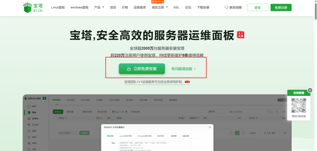 宝塔官网:宝塔面板(bt.cn) 简单好用的Linux/Windows服务器运维管理面板